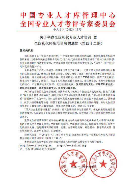 1、本次培训期间全国专业人才考评专家委员会将受理考评通过礼仪培训师、礼仪(礼宾)师、司仪等项资质的认证工作(证书查询网址http://www.cncctu.gov.cn);