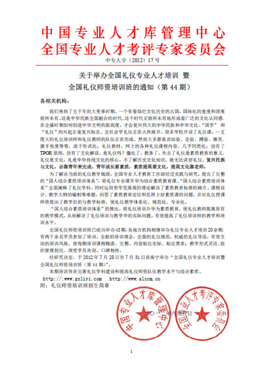 1、本次培训期间全国专业人才考评专家委员会将受理考评通过礼仪培训师、礼仪(礼宾)师、司仪等项资质的认证工作(证书查询网址http://www.cncctu.gov.cn);