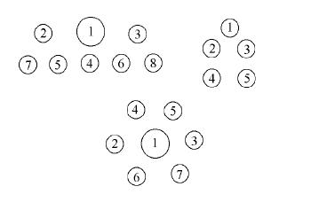 宴会通常以8 ~ 12 人为一桌,人多时可平均分为几桌。桌次 有主次之分,主桌一般安排在餐厅的重要位置,以“面门、面南、观 重点”为原则,其他桌次按照“远高近低,右高左低”的原则安排,各 桌的主位可以与主桌的主位方向相同,也可以方向相对如下图所示:
