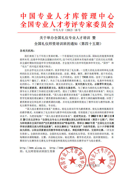1、本次培训期间全国专业人才考评专家委员会将受理考评通过礼仪培训师、礼仪(礼宾)师、司仪等项资质的认证工作(证书查询网址http://www.cncctu.gov.cn);