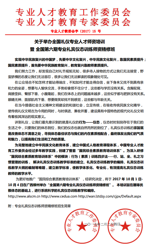招生简章 一、会议组织: 举办单位:中国智慧工程研究会(教育部主管)专业人才教育工作部 支持单位:365365最快线路检测中心 专业人才教育专家委员会 专业人才教育工作部广西培训中心 承办单位:柳州铁道职业技术学院 北京大智世纪文化咨询服务中心 二、报名对象: 1、热爱礼仪教育事业、希望对礼宾仪态进行深入研究的礼仪从业人员; 2、从事形象顾问、教育培训、展示表演、模特表演、礼宾礼仪等工作;希望在个人体态及 仪态举止方面有更深造诣的各界人士; 3、企事业单位内训师、专职培训师、礼仪主持人、模特等; 4、各院校素质教育基地、德育部、团委、礼仪教学负责人、礼仪教师、礼宾训练师; 5、青春期体态开始改变,希望由此开始塑造完美体态的青少年; 6、即将步入社会的青年、刚入职场的新人,希望掌握职场举止规则的年轻人士等。 三、培训模块: “国民综合素质教育培训体系”之模块:行为(素质)训练四步法----行、站、坐、礼习惯管理:礼仪行为操作,结合“九容动静 8 姿态”运用案例教学、情景教学,演绎行、站、坐、礼的规矩;优雅得体的仪态礼仪教学,专门针对职场、社交及公众场合行为举止。 仪态训练:掌握行为语言的运用:行为语言是怎样表现:行是一种意志的展现;站是一种力 量的表现;坐是一种气势的体现;礼是一种素养的实现。气质训练:精心雕塑你的面部表情、身体肌肉线条、通过收腹、开肩、拉颈、提臀的专业化、系统化训练教程,让你拥有优雅的体态,彰显自身气质。 礼宾训练:建立礼宾服务人员(酒店服务、航空服务、银行服务、医护服务、大型赛事活动 礼宾人员等)的仪态训练教学标准,使教学体系化、专业化。礼宾编排:解析展示仪态规范动作队形的编排技巧;解决礼宾仪态训练教学标准的建立等, 建立教学标准,有效提高礼宾仪态训练教师的教学培训水平。 四、授课师资: ● 名师亲临现场授课指导 赵梓汝: 全国专业人才教育工作部主任、全国专业人才教育专家委员会委员,受聘于贵州大 学旅游与文化产业学院讲座教授,主编《礼仪师培训教程》。从业十多年来,赵老师已为诸多企事业单位,世界五百强公司,各级别的政府公务员进行授课,并担任多家企业高管礼仪、形象管理顾问及衣橱顾问。积累了丰富的礼仪、形象实操经验,深受培训对象的喜爱 。 王 琳:中华教育艺术家协会理事;全国专业人才教育专家委员会礼仪委员;柳州铁道职业技 术学院成人教育学院院长、副教授;全国专业人才教育工作部广西培训中心主任;多次担任礼仪大赛评委主任、裁判长;受聘于贵州大学旅游与文化产业学院讲座教授。是教育艺术泰斗和演讲泰斗李燕杰老师首批国学礼仪弟子,著名礼仪专家金正昆教授为亲授导师。全国大学生文化素质教育“十二五”规划教材/全国职业院校礼仪修养系列规划教材《公关礼仪》主编、发表礼仪专业论文若干篇。 舒 婷:东方女神导师团发起人、专业人才教育工作部广州礼仪培训中心 主任、专业人才教 育委员会礼仪委员、高级礼仪培训师、高级礼仪(礼宾)师、澳大利亚 JDW 商学院 礼仪学 士中华夫人国际大赛 仪态培训指导师、全球时尚国际女性大赛 仪态指导老师。 五、本次培训班收益: 1、本次培训后每位学员可免费获得由王琳老师多年积累编排制作的精品礼宾仪态展示背景 音 乐系列数首,还可获得一套礼仪大赛光碟。 2、凡参加本次培训班并考试通过、申请高级专业礼宾仪态训练师和参加全国专业人才教育工 作部举办的礼仪师资培训班申请高级礼仪培训师或高级礼仪(礼宾)师者,可申请成为全国 专业人才教育专家委员会礼仪委员(此证书免费),加入高级 QQ 群,免费享受高级 QQ 群继续学习的待遇;可获得本项目各地机构讲师资格,特别优秀者向全国推广,并将讲师资料 公布在官网(www.www.lions0769.com 和www.alscm.cn)进行宣传;获专家资格的学员均可申报建 立地方专业人才教育工作站。 3、参加本次培训在雕琢优雅体态的基础上,进行系统科学的礼宾训练教学和编排。找到女性 气质中的优雅,同时您还能成为一名专业有素的礼宾仪态训练师,您会在课程中学习到系统 科学的礼宾仪态训练方法,掌握仪态展示的编排技巧。 4、全国专业人才教育专家委员会在国内首推礼仪培训师、礼仪(礼宾)师、司仪系列体系,同 时还着重推出课程开发设计管理师、形象设计管理师、专业礼仪官、公共关系专员、职业生 涯规划咨询师、素质教育培训师、素质教育导师、情商辅导师等项目,在各项目体系下设立 特许培训合作机构,展开一系列的培训、考试等工作(详细情况登录 http://www.www.lions0769.com)。 六、相关费用: 会务培训费为 3980 元人民币/人(包含定制统一服装费用、两双连裤丝袜、礼仪比赛光盘、专业制作比赛、训练音乐、培训资料等)。凡具有教师资格证书者、持有学生证的在校学生、参加过专业人才教育工作部举办的礼仪师资培训的学员均可优惠价为 3680 元/人(不重复享受优惠)。凡之前参加过专业人才教育工作部举办的仪态训练师资班学员,复训费为 2800元人民币/人。高级专业礼宾仪态训练师证书综合费用 1240 元(证书费用含报名、考试、工本费、注册网络维护费等),中级专业礼宾仪态训练师证书综合费用 700 元。会务住宿统一安排,食宿费用自理。需要银行转帐的学员,请务必在汇款凭证上