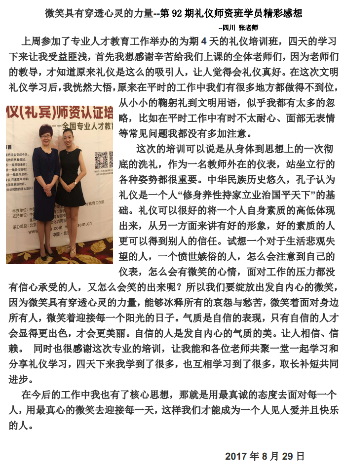 92期专业人才教育礼仪师资班学习心得—四川张老师