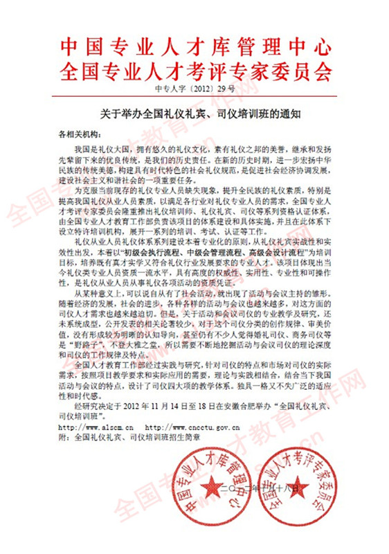 关于举办全国礼仪礼宾、司仪培训班的通知