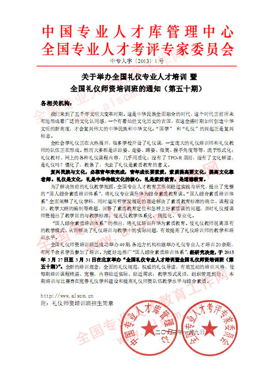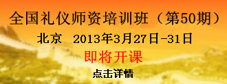 全国礼仪师资培训班已成功举办49期,各地方机构相继举办礼仪专业人才培训20余期,有两千余名学员参加了培训。为更好地推广“国人综合素质培训体系”,经研究决定,于2013年3月27日至3月31日在北京举办“全国礼仪专业人才培训暨全国礼仪师资培训班(第五十期)”。全新的培训理念,全面的礼仪规范,权威的礼仪导读,有效互动的培训风格,使每期培训课程精湛、完整,内容贴近实际、贴近需求;教学形式灵活、组织管理到位, 本期培训与比赛旨在完善礼仪学科建设和提高礼仪师资队伍教学水平与综合素质。
